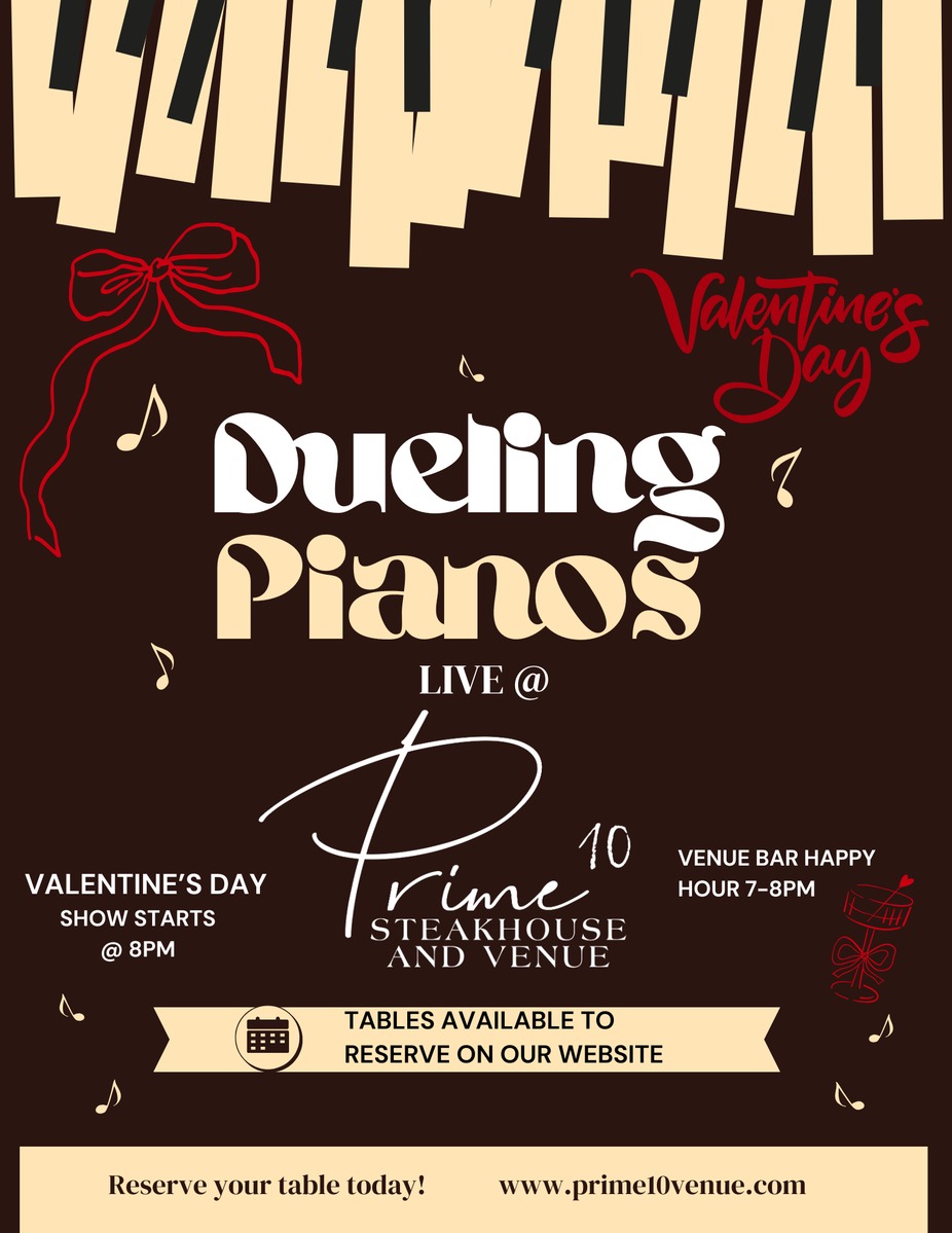 This Valentine’s Day, Prime 10 Steakhouse & Venue is turning up the energy with an unforgettable night of Dueling Pianos on Saturday, February 14th. Whether you’re planning a romantic date night, a fun night out with friends, or something a little different from the traditional Valentine’s dinner, this is one event you won’t want to miss.